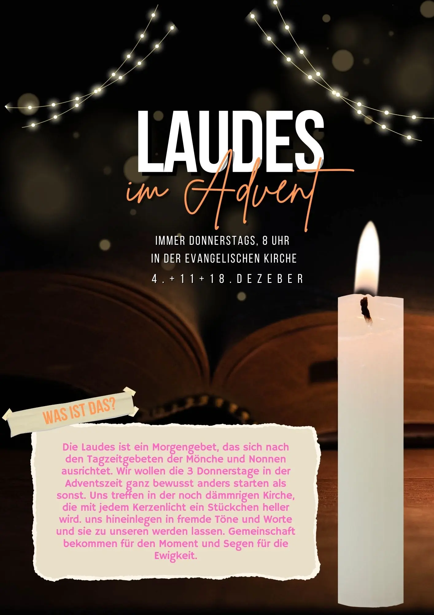 Die Laudes ist ein spiritueller Start in den Tag, der sich nach dem Ritus der Tagzeitgebete von Mönchen und Nonnen ausrichtet. Wir wollen die 3 Donnerstage in der Adventszeit ganz bewusst anders beginnen als sonst. Uns treffen in der noch dämmrigen Kirche, die mit jedem Kerzenlicht ein Stückchen heller wird. Uns hineinlegen in fremde Töne und Worte und sie zu unseren werden lassen. Gemeinschaft bekommen für den Moment und Segen für die Ewigkeit. Sei dabei und spür´s.