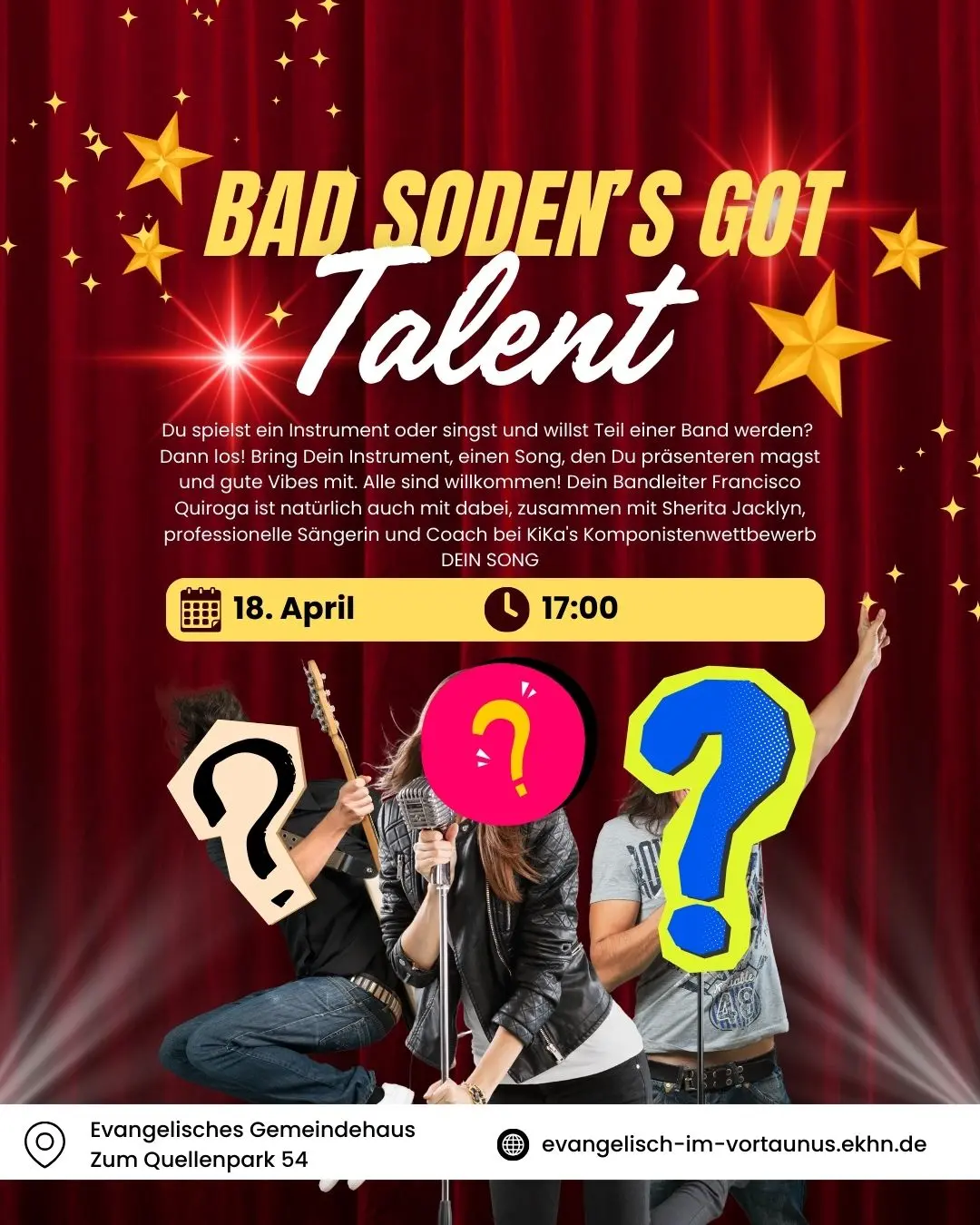 Community macht, die zusammen jammen und eine gute Zeit haben? Auch den einen oder anderen Auftritt? Dann komm zur Bandgründung am 18. April ins Gemeindehaus. Dein Bandleiter Francisco Quiroga ist natürlich auch mit dabei, zusammen mit Sherita Jacklyn, professionelle Sängerin und Coach bei KiKa's Komponistenwettbewerb DEIN SONG und Pfarrerin Marlene Hering, die das Event hosted und sich schon auf den einen oder anderen Gottesdienst mit Euch freut.