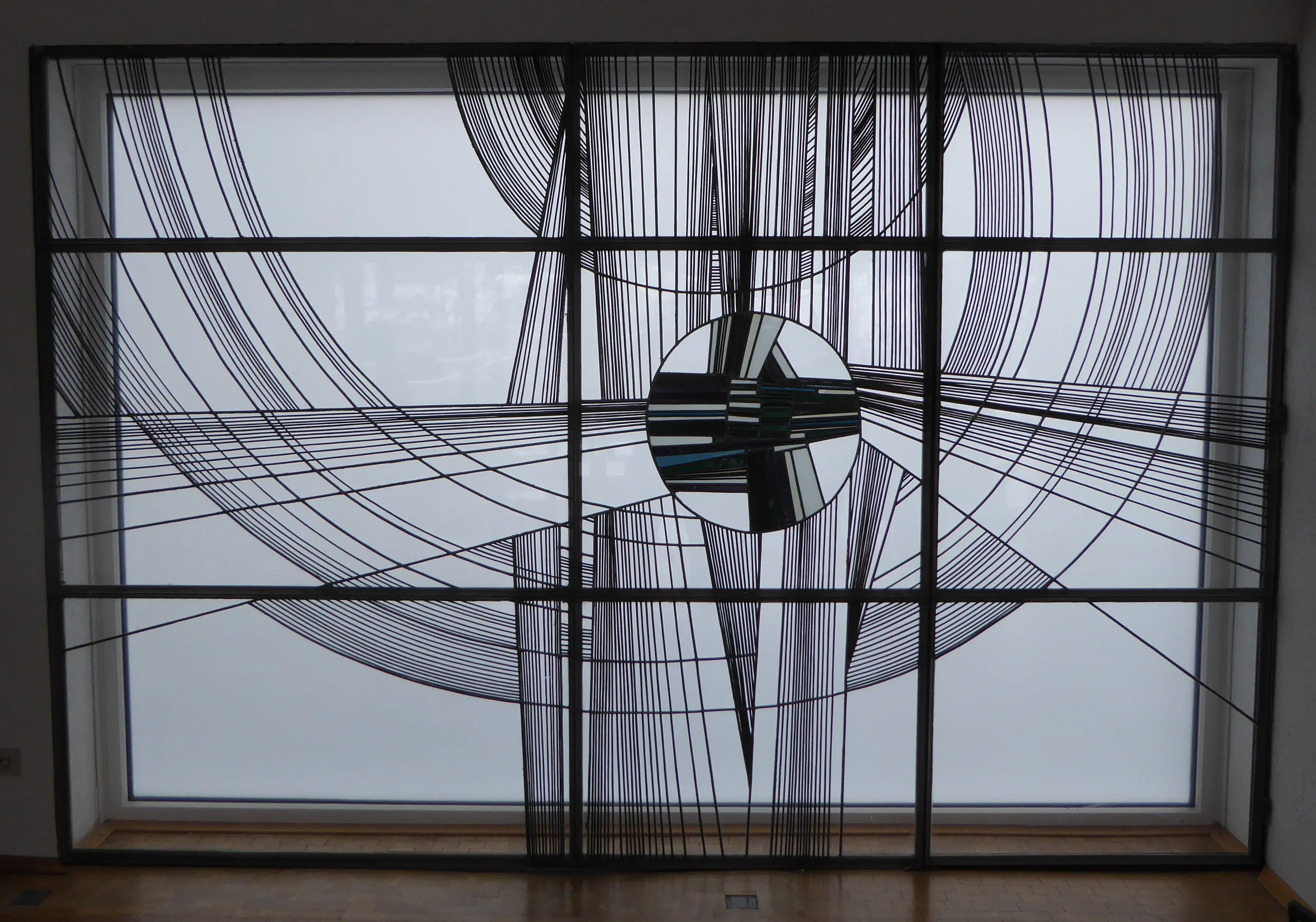 Ein Blickfang im Gottesdienstraum des Gemeindezentrums ist das große Glasfenster.
