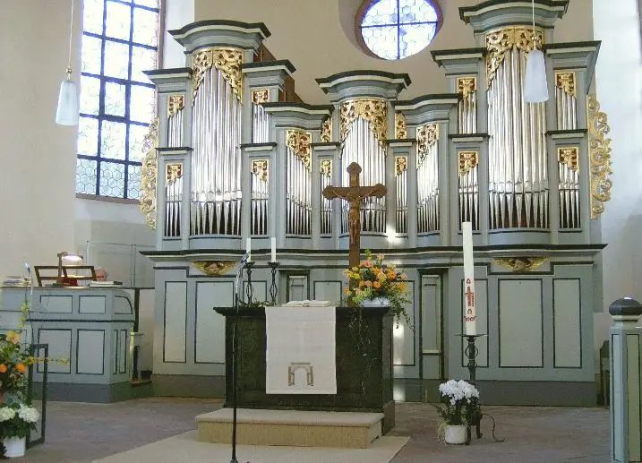Der schlichte Saalbau mit halbrundem Chor gilt als schönes Beispiel ländlichen Barocks. Teile der Innenausstattung, gestiftet vom Salinenbesitzer Friedrich Wilhelm von Malapart-Neuville, stammen aus dem späten 18. Jahrhundert.